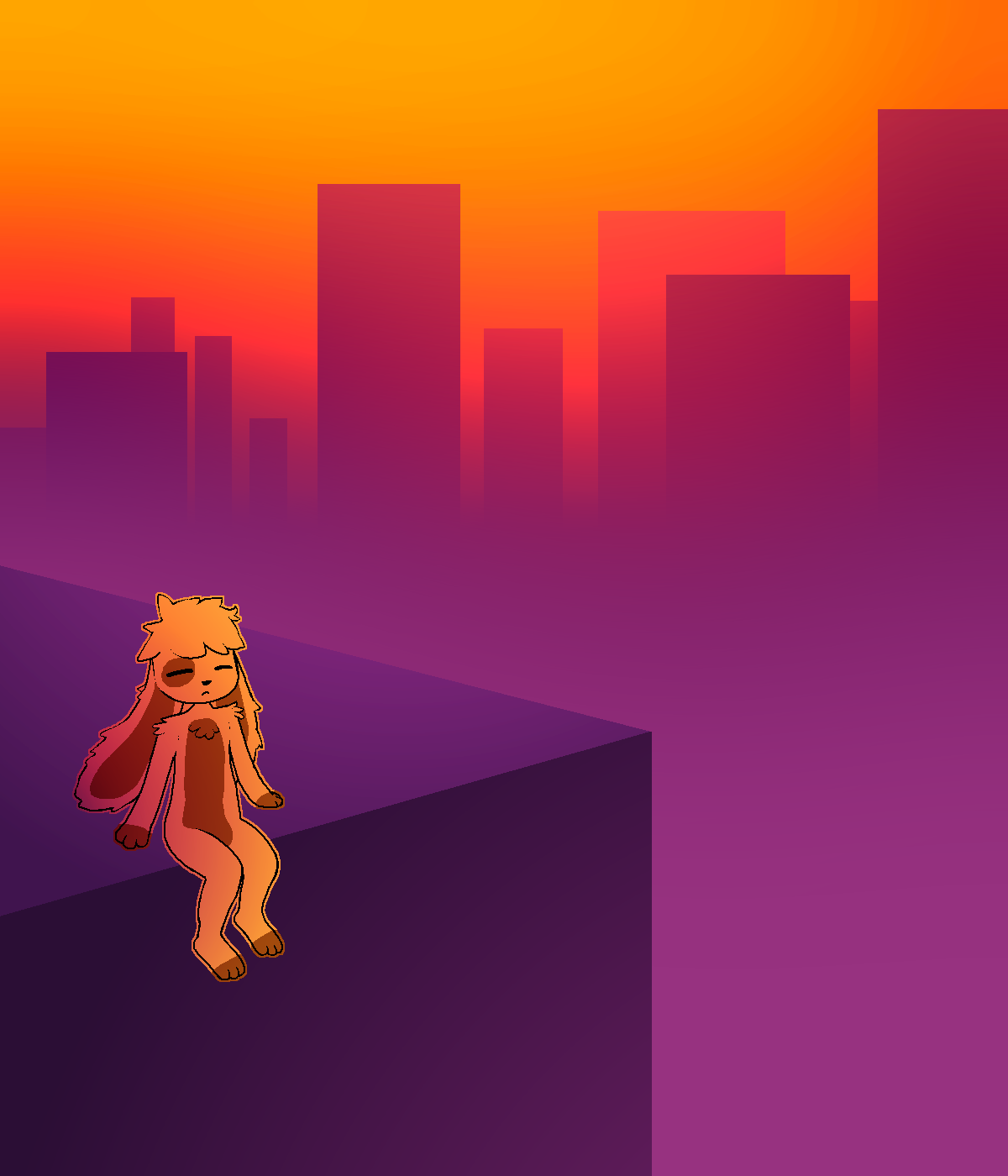 Poster artwork of Sundae sitting on the edge of a non-descript building's rooftop, with distant skyscrapers and fog looming.