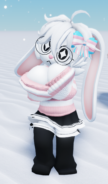 Modular vector shape artwork of a white bunny wearing a trans pride hair bow, glasses and a pink and white sweater. They're holding their paws up against their face and blushing with their eyes closed.